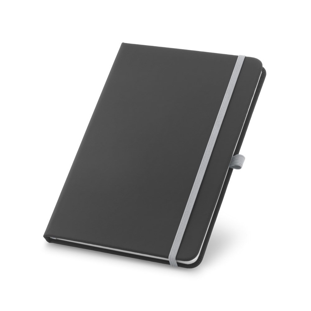 Caderno A5 em c. sintético com capa dura. Contém 80 folhas pautadas, fita separadora, elástico e suporte para esferográfica (não inclusa). 140 x 210 mm