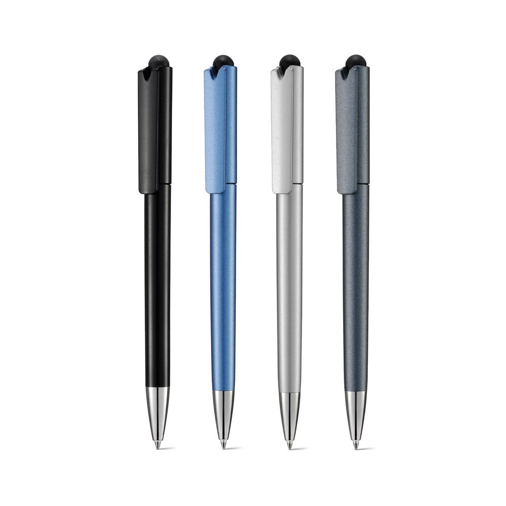 Esferográfica com acabamento metalizado e ponteira de metal touch. Tinta Dokumental® até 2,5km de escrita. A esferográfica na cor 103 tem escrita a preto, as restantes cores têm escrita azul. ø9 x 145 mm