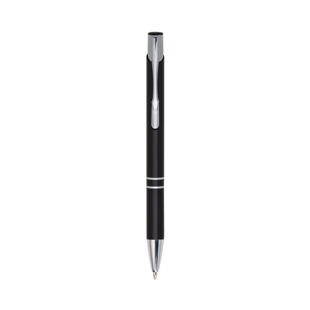 Descrição: Caneta metal inteira colorida com detalhes prata. Clip metal com a ponta do acionador preto, parte inferior com dois anéis prata. Aciona por clique.
