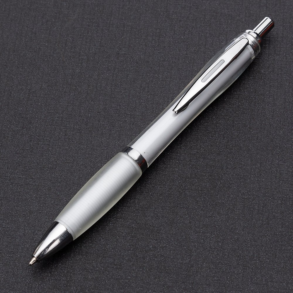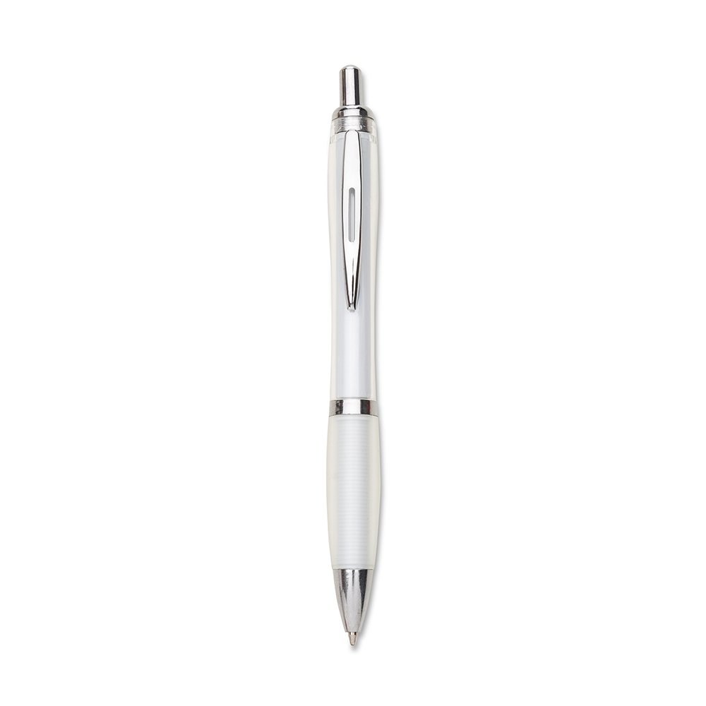 Caneta plástica com “carcaça” transparente” e parte interna branca. Clip de metal, aciona por clique.