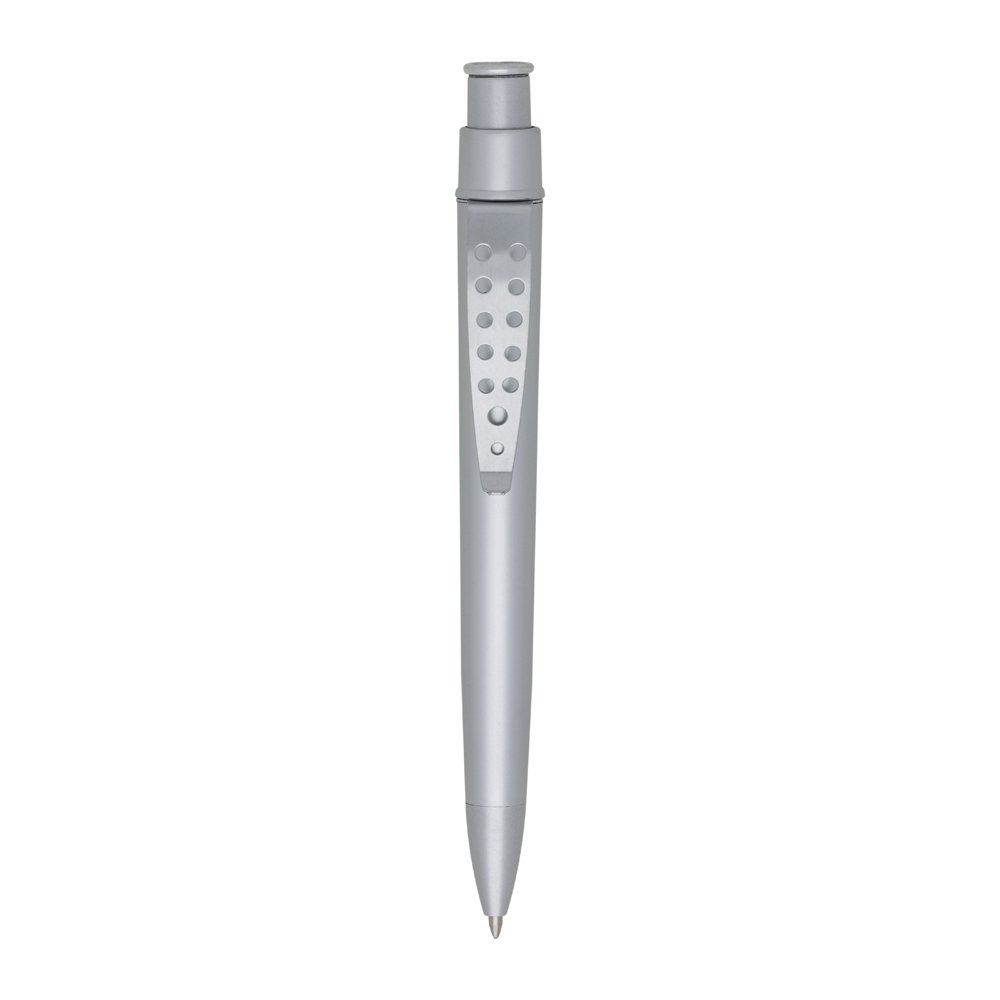 Descrição: Caneta plástica fosca inteira colorida com detalhes prata. Clip de metal com doze furos, aciona por clique.