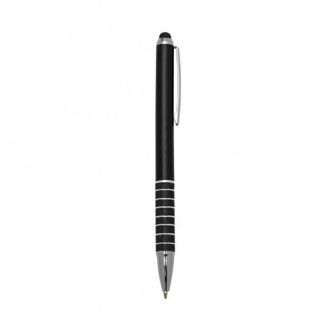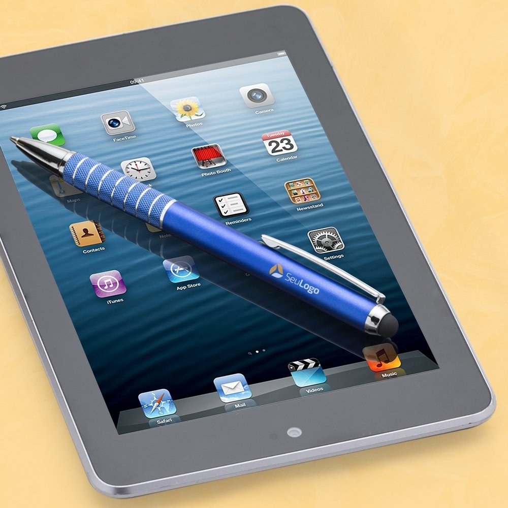 Descrição: Caneta plástica esferográfica e touch, inteira colorida com detalhes prata. Clip metal, possui oito anéis com relevo na parte inferior. Aciona por giro.