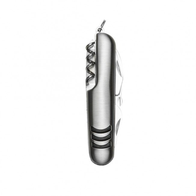 Canivete metal 7 funções com detalhes emborrachados preto(três linhas frente e verso). Possui: lâmina de corte, mini tesoura, abridor de lata, abridor de garrafa, chave phillips, lixa e saca rolhas. Acompanha bainha de nylon.
