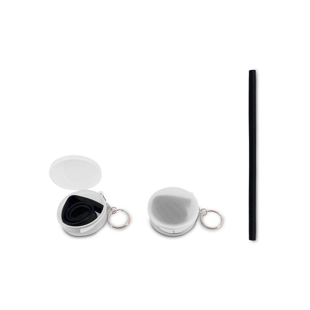 Descrição: Canudo flexível de silicone em estojo plástico fosco com chaveiro.