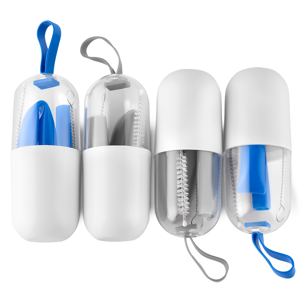 Kit canudo silicone portátil, com embalagem protetora e escova para limpeza. Escova em aço inox.