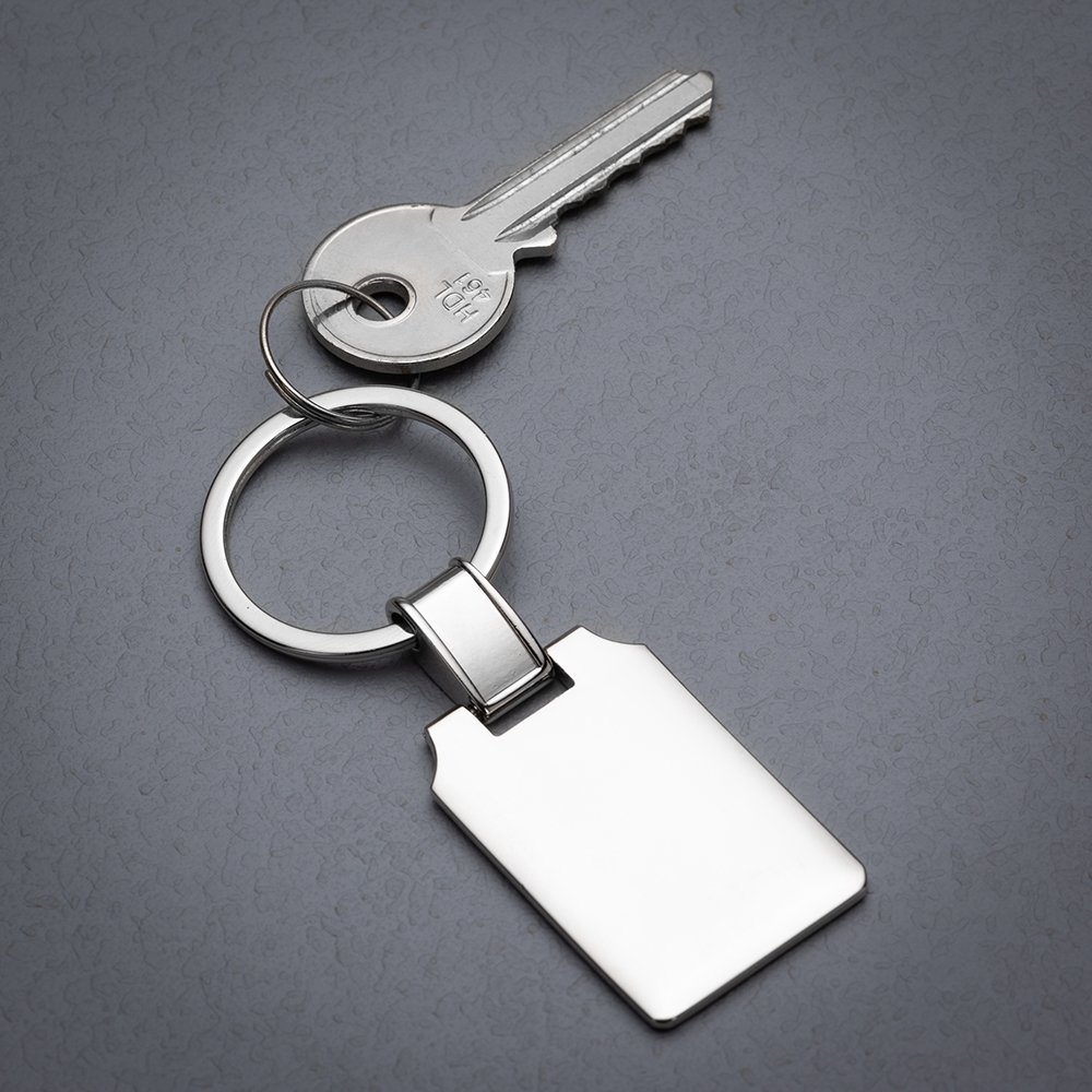 Chaveiro metal retangular brilhante, frente e verso iguais, suporte da argola giratório.