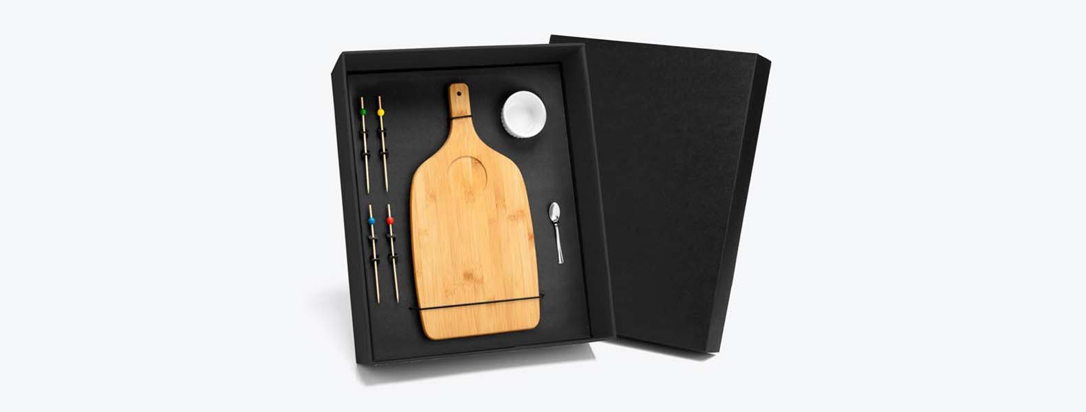 Uma gravação a Laser na tábua e na tampa da caixa.