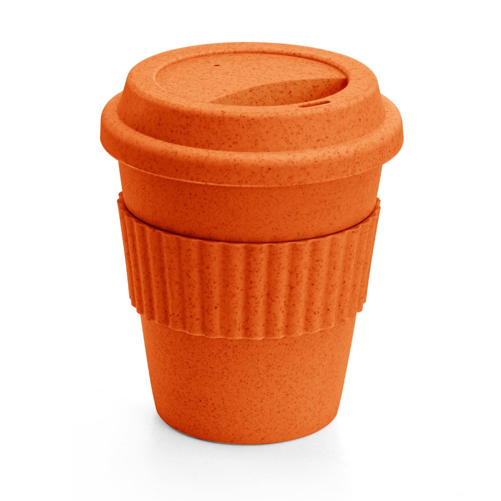 Copo de viagem com tampa em fibra de bambu (50%) e PP (50%), com capacidade até 380 ml e tira em silicone para facilitar o transporte de bebidas quentes. Food grade. ø95 x 114 mm