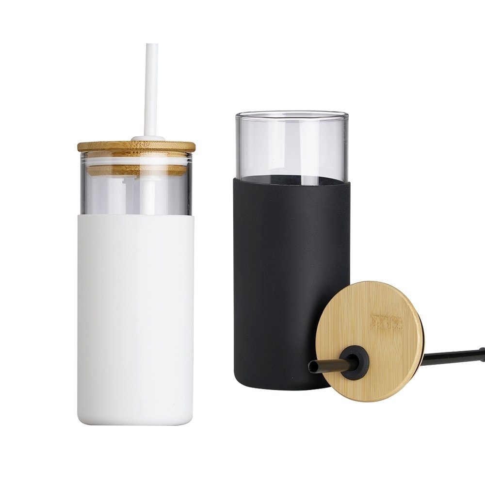Descrição: Copo de vidro borossilicato resistente ao calor com capa protetora de silicone. Acompanha uma tampa de bambu e canudo de silicone. Capacidade de 450ml.