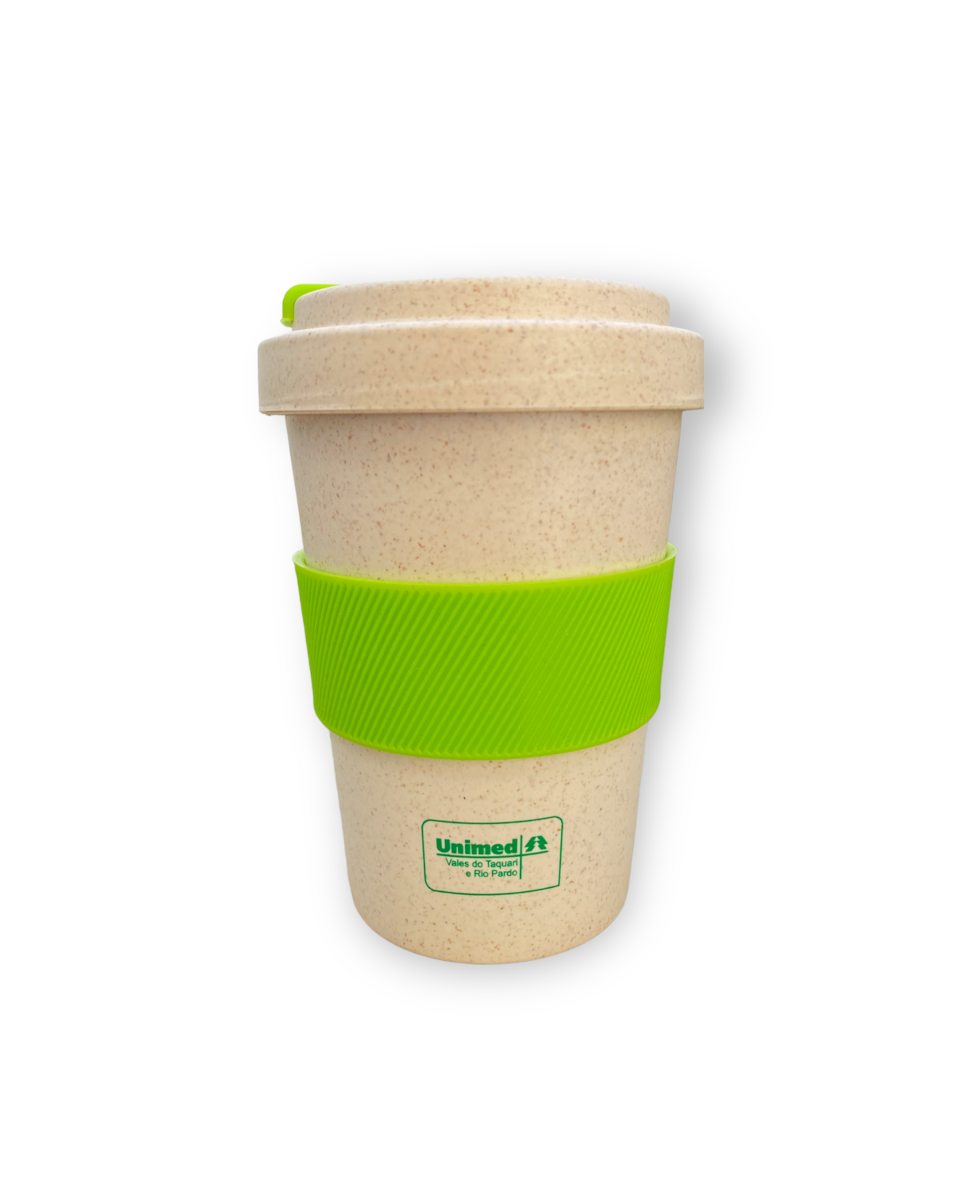 Copo de viagem em fibra de bambu (50%) e PP (50%), com tira de silicone no corpo para facilitar o transporte. A tampa em silicone no topo roda para tapar abertura e prevenir salpicos. Capacidade até 500 ml. Food grade. ø95 x 140 mm