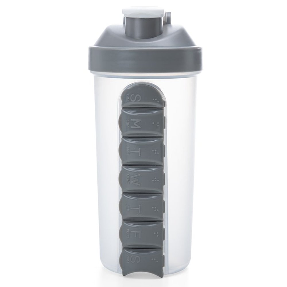 Coqueteleira plástica 750ml com porta comprimido. Copo transparente fosco com medição em ml e oz(600ml e 20oz), apesar do copo constar esta medição ele suporta até 750ml (ultrapassa a marcação); parte frontal com pequenas portas especificadas com os dias da semana em siglas inglês/francês, basta levantar/abrir à direita para a abertura de cada compartimento. Tampa de rosca com pequena alça regulável e tampa protetora para o bocal.