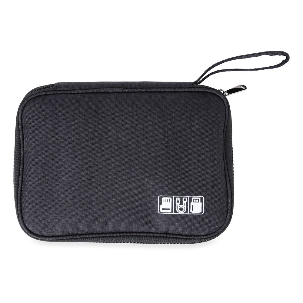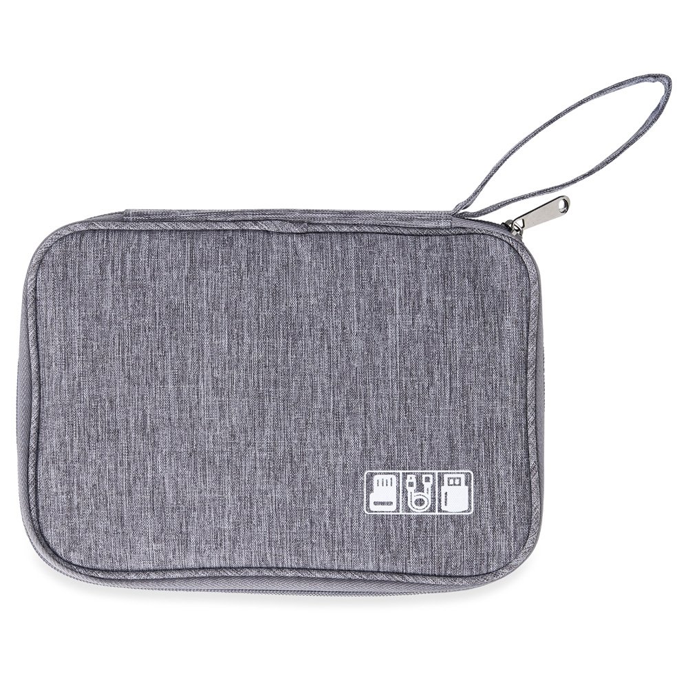 Descrição: Estojo para kit tecnológico a prova d’água de poliéster possui 5 compartimentos com elástico e uma pequena tela de proteção, 3 elásticos centralizados, um bolso de tela com zíper e uma alça de mão.