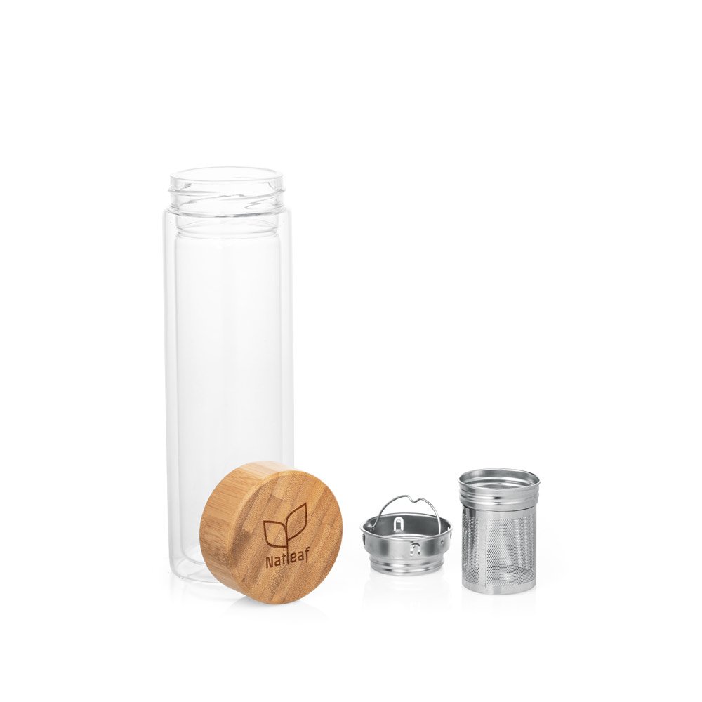 Garrafa em vidro de borossilicato com parede dupla e tampa em bambu. Incluso 2 infusores em aço inox. A garrafa tem uma capacidade até 490 ml. Apta para ir a máquina de lavar, removendo a tampa. Fornecida em caixa em papel kraft. ø72 x 234 mm