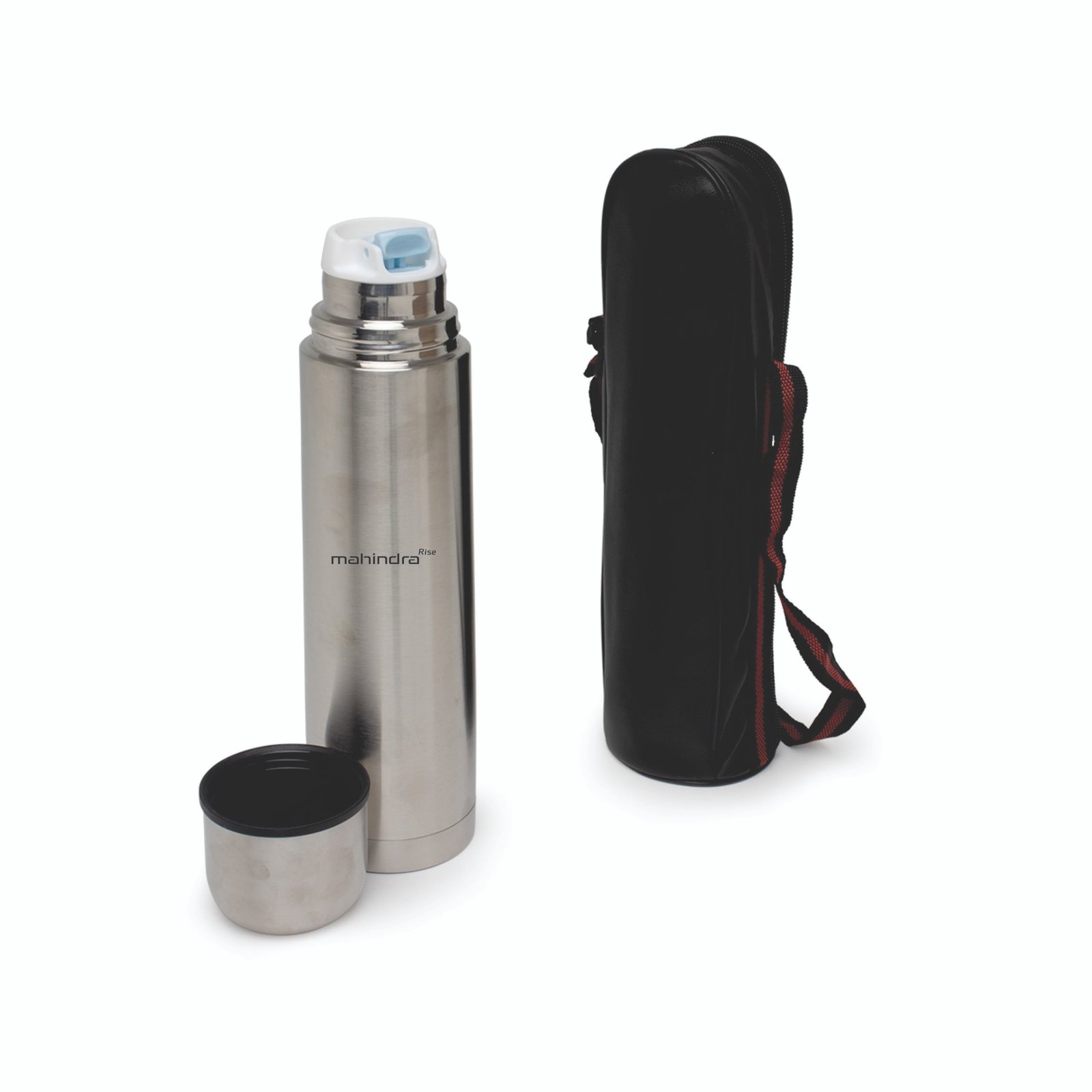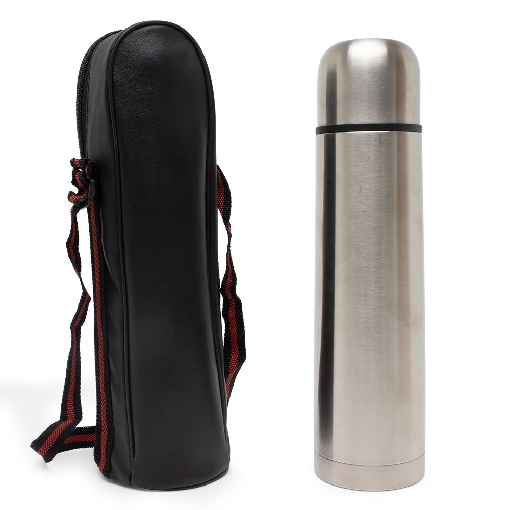 Descrição: Garrafa térmica parede dupla em inox com capacidade de 750ml, acompanha capa de couro sintético com alça de nylon.