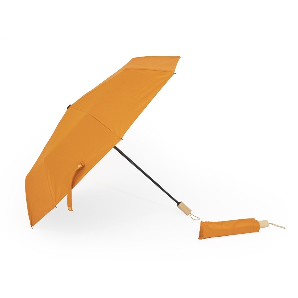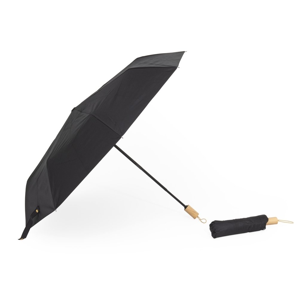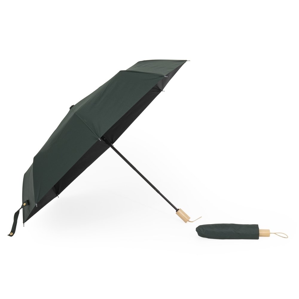 Descrição: Guarda-chuva manual de nylon com proteção UV, tecido interno em vinil. Com 8 varetas e estrutura em aço, possui botão de abertura e pegador de madeira com alça de nylon. Acompanha capa protetora.