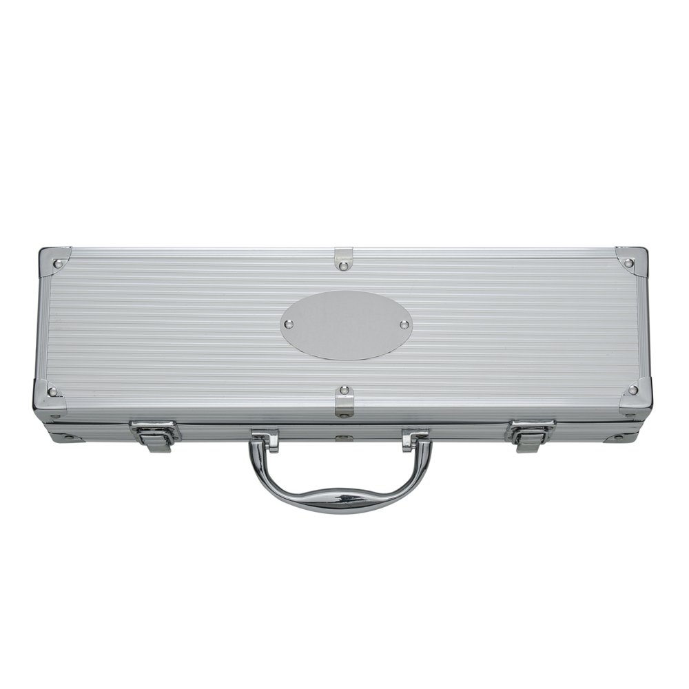 Kit churrasco 4 peças em maleta de alumínio com relevo. Possui: espátula, pegador, garfo e faca em inox (todas peças possuem proteção plástica) detalhes em metal nas bordas da maleta, duas dobradiças na parte inferior, uma alça e duas presilhas para travar/abrir a maleta. Parte interna revestida de tecido tnt e velcro para guardar as peças.