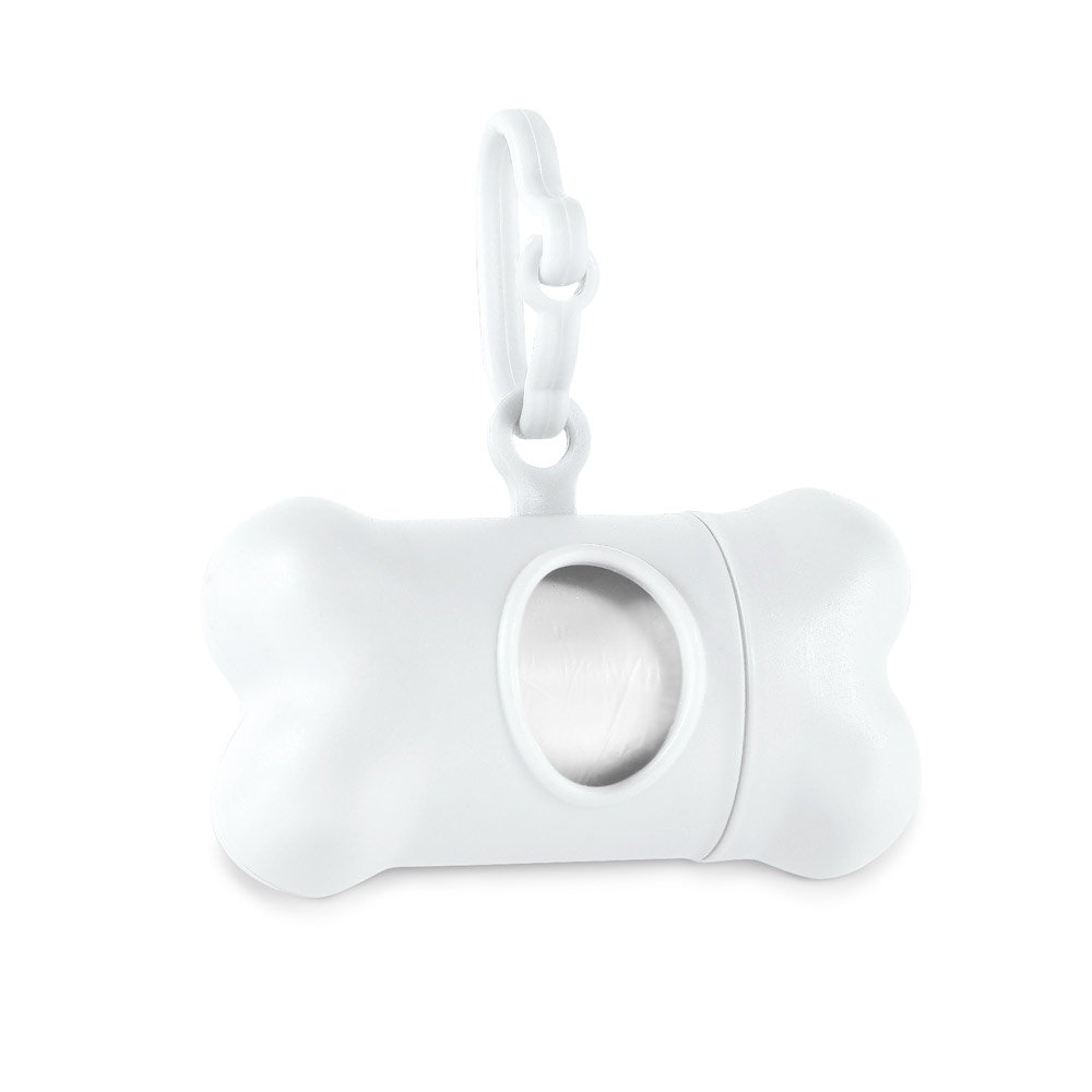 Kit de higiene para cachorro em PP. Contém 20 sacos higiénicos em PE. Porta-saco em formato de osso. Fechada: 111 x 21 x 15 mm
