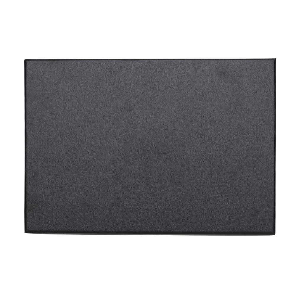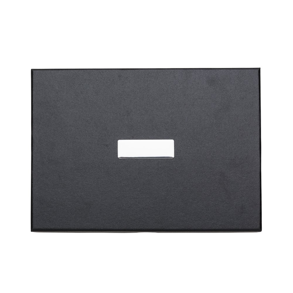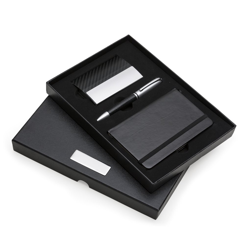 Descrição: Kit executivo 3 peças em estojo de papelão com tampa e parte interna revestida de espuma. Contém: porta cartão de couro sintético texturizado com detalhes prata brilhante, caneta metal fosca com detalhe emborrachado preto, caderneta tipo moleskine em couro sintético com aproximadamente 80 folhas amarelas pautadas. Acompanha placa metálica para gravação.