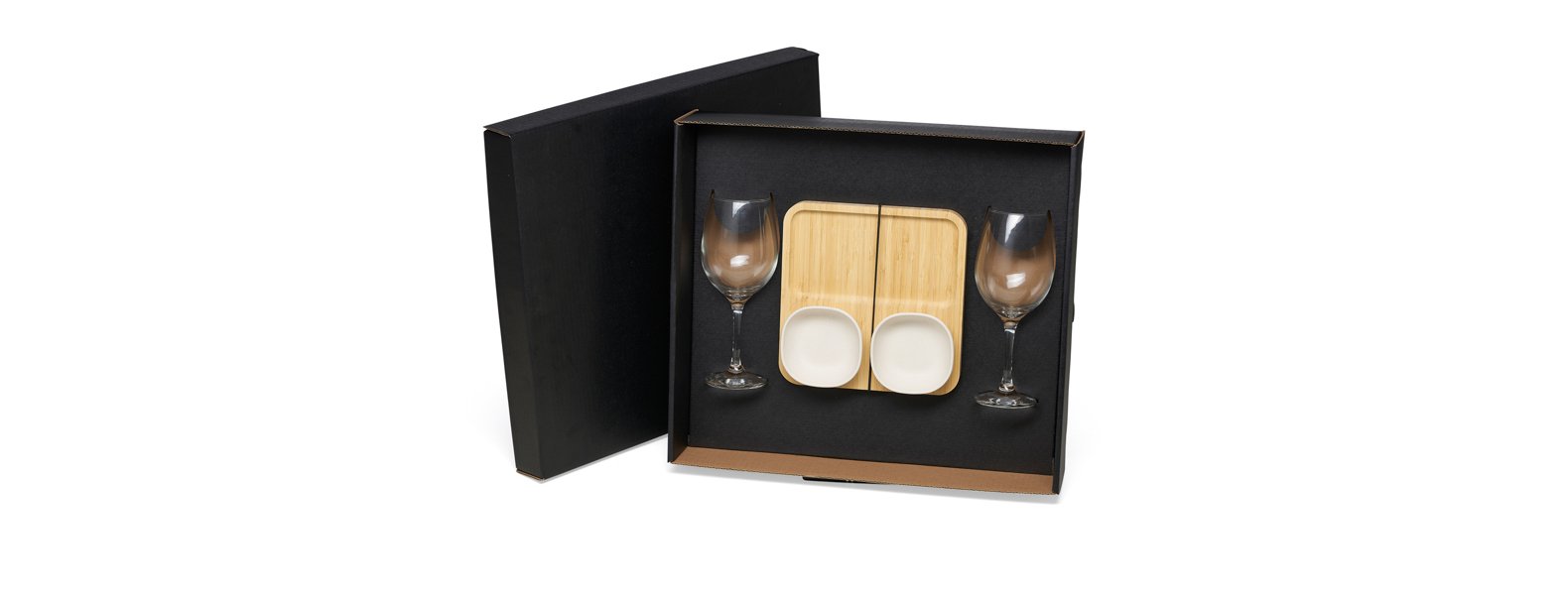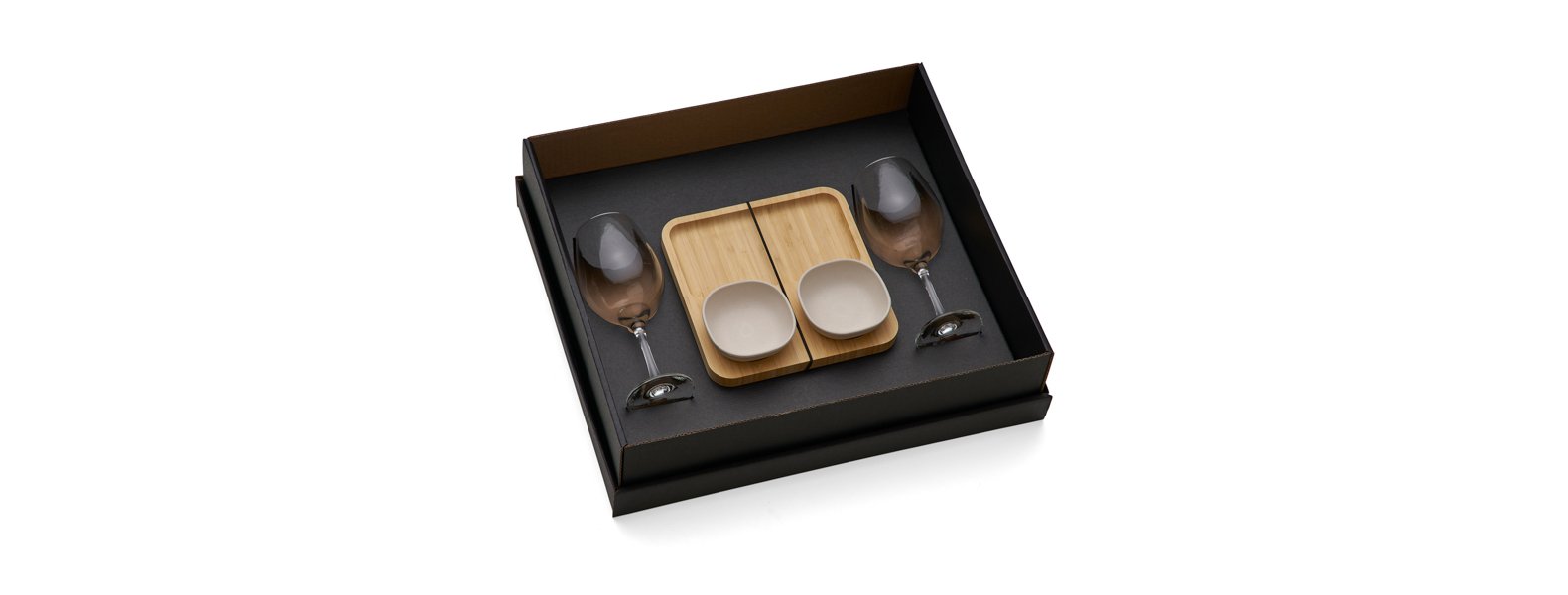 Conta com petisqueira com 2 potes em bambu; duas taças em vidro.