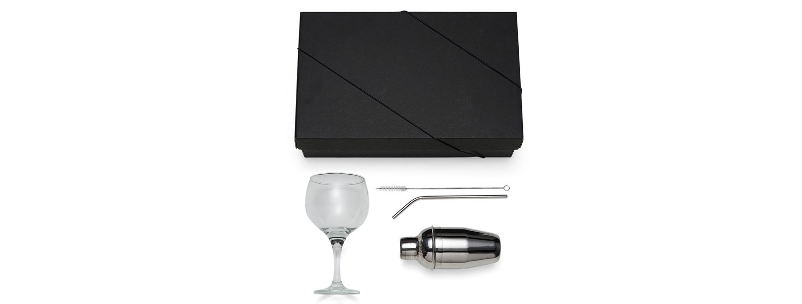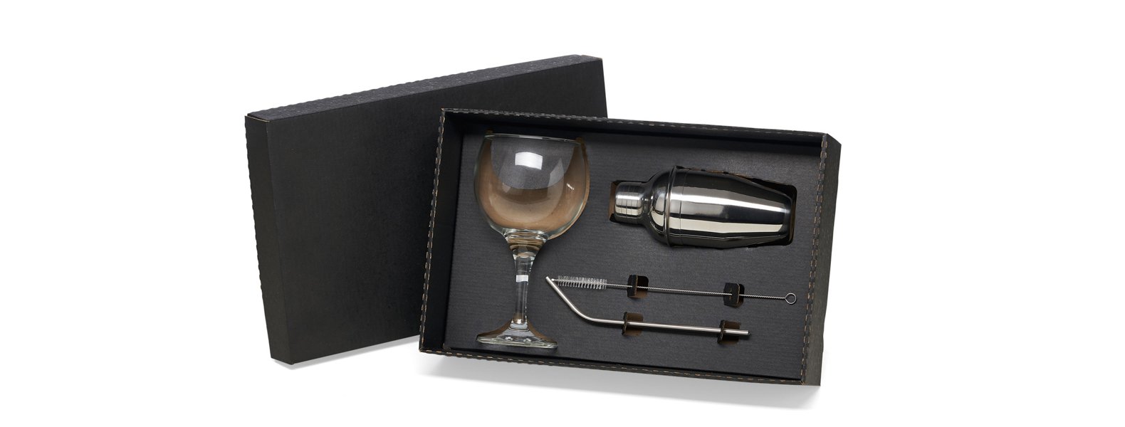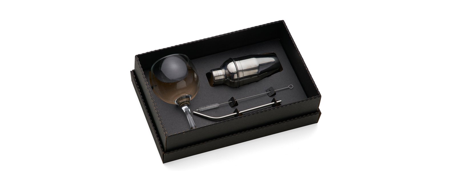 Conta com coqueteleira, canudo e limpador em inox; taça em vidro.