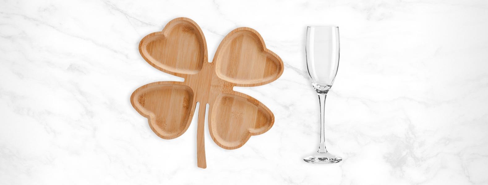 Kit para Petisco e Champagne conta com petisqueira formato de trevo em Bambu; uma taça para champagne em vidro; espaço para garrafa com palha. NÃO ACOMPANHA GARRAFA. Estão perfeitamente acomodados em uma caixa para presentear.