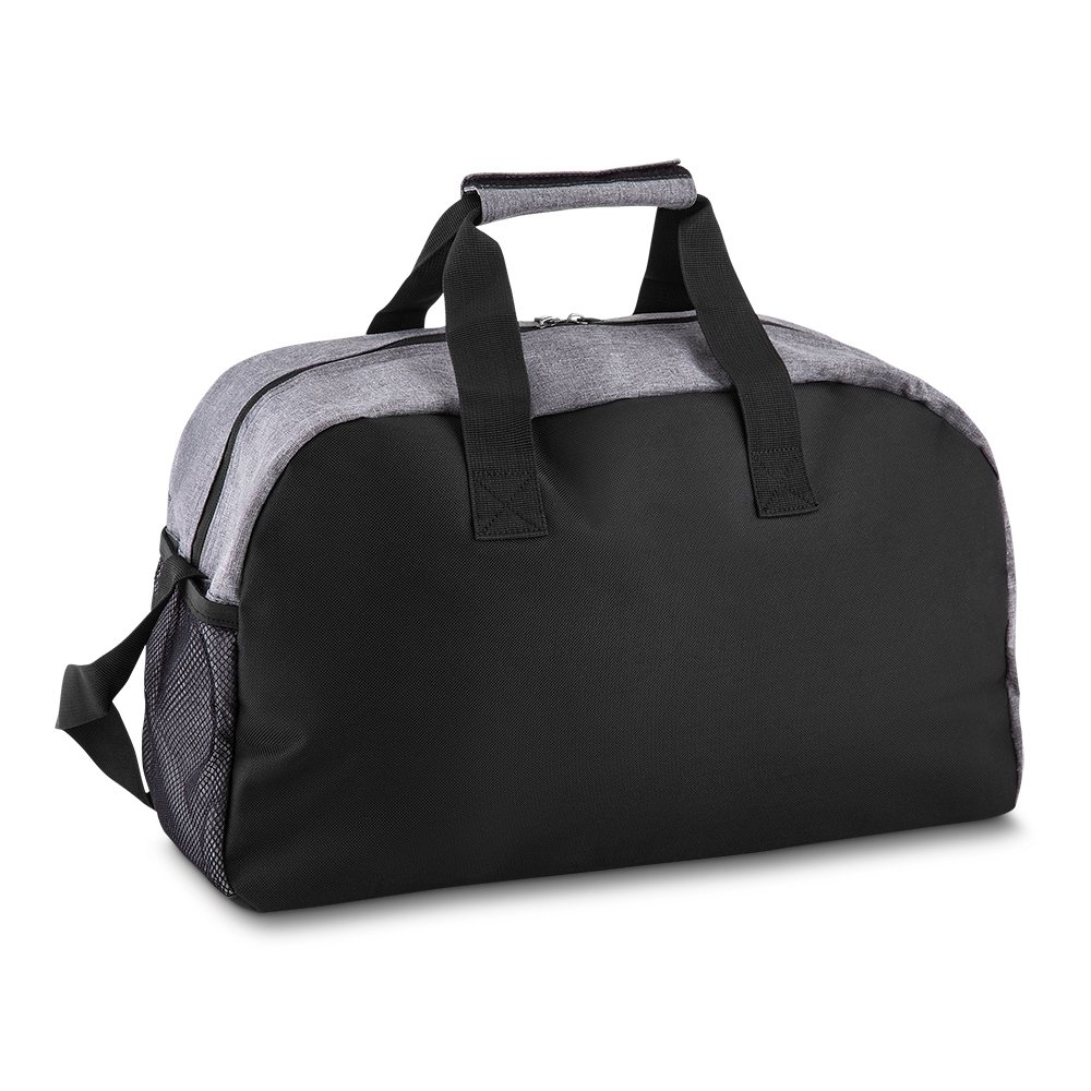 Descrição: Mala esportiva de poliéster. Possui bolso frontal, bolso lateral de malha e bolso grande superior. Alça de mão com pegador cinza de velcro e alça transversal ajustável.