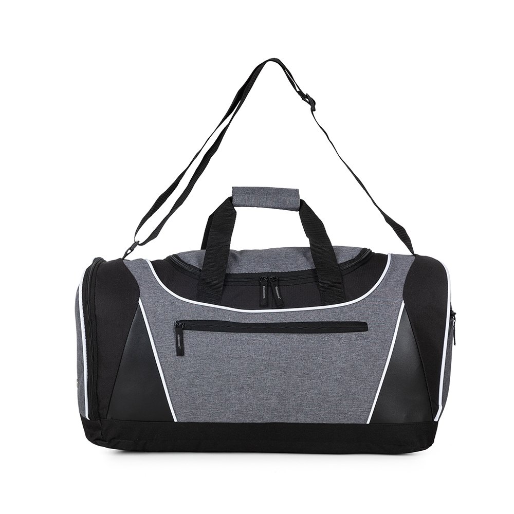 Descrição: Mala esportiva de poliéster com detalhe em couro sintético, contém um compartimento principal com placa semirrígida no fundo, compartimento lateral para calçados com aberturas respiratórias, compartimento frontal e compartimento lateral pequeno. Alça transversal ajustável e alças para mãos com fecho de velcro.