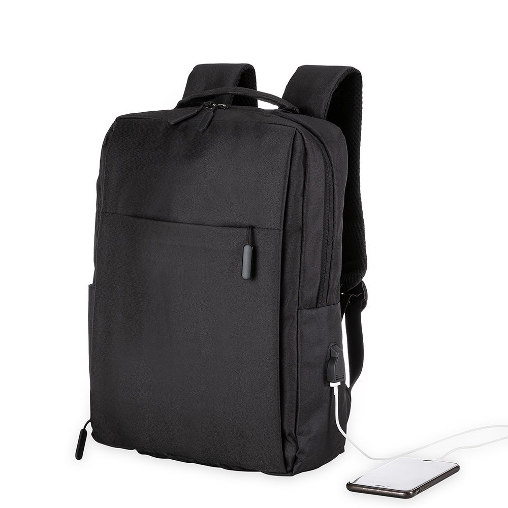 Descrição: Mochila confeccionada em nylon com compartimento para notebook até 15,6 polegadas. Contém compartimento grande com divisórias para documentos, eletrônicos e caneta, compartimento mediano com abertura vertical, compartimento frontal, bolsos laterais e adaptador USB externo com cabo acoplado, permitindo a conexão de um carregador portátil de dentro da mochila e transferência da carga para o lado externo, ocultando o carregador e viabilizando a utilização do celular durante o processo. Contém zíperes com pegadores plásticos, alça de mão em nylon e alças para as costas ajustáveis com revestimento espumado antitranspirante.