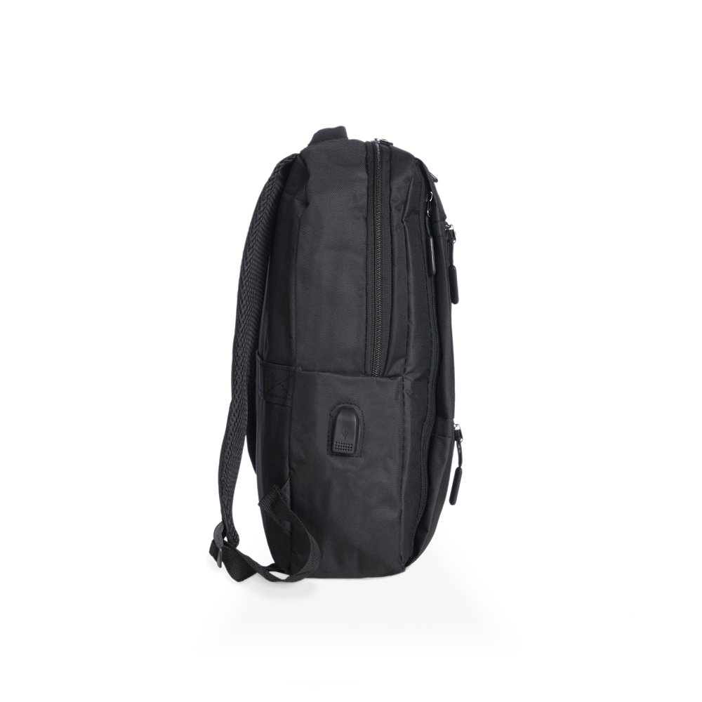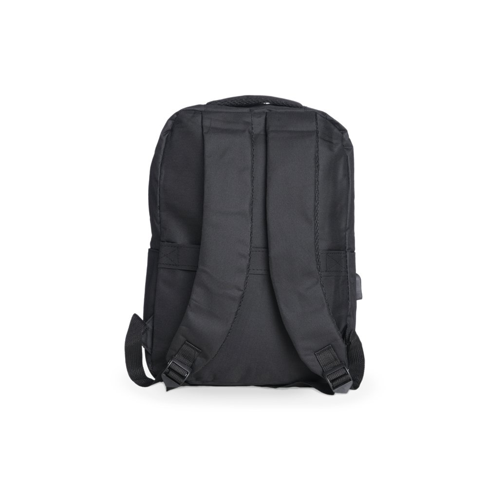 Descrição: Mochila confeccionada em nylon com compartimento para notebook até 15,6 polegadas. Contém compartimento grande com divisórias para documentos, eletrônicos e caneta, dois compartimentos frontais com abertura horizontal, bolso lateral e adaptador USB externo com cabo acoplado, permitindo a conexão de um carregador portátil de dentro da mochila e transferência da carga para o lado externo, ocultando o carregador e viabilizando a utilização do celular durante o processo. Contém zíperes com pegadores plásticos, alça de mão em nylon, alças para as costas ajustáveis com revestimento espumado antitranspirante e alça horizontal para encaixe em malas de viagem.
