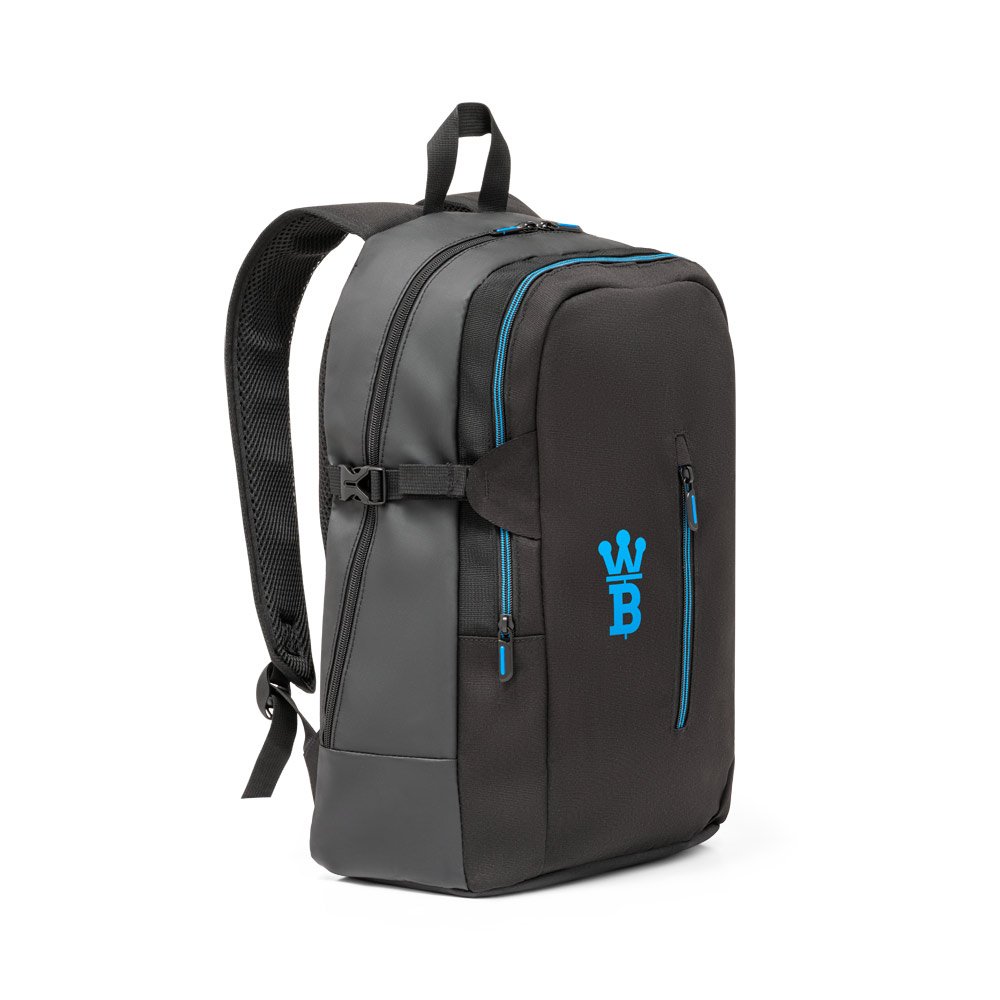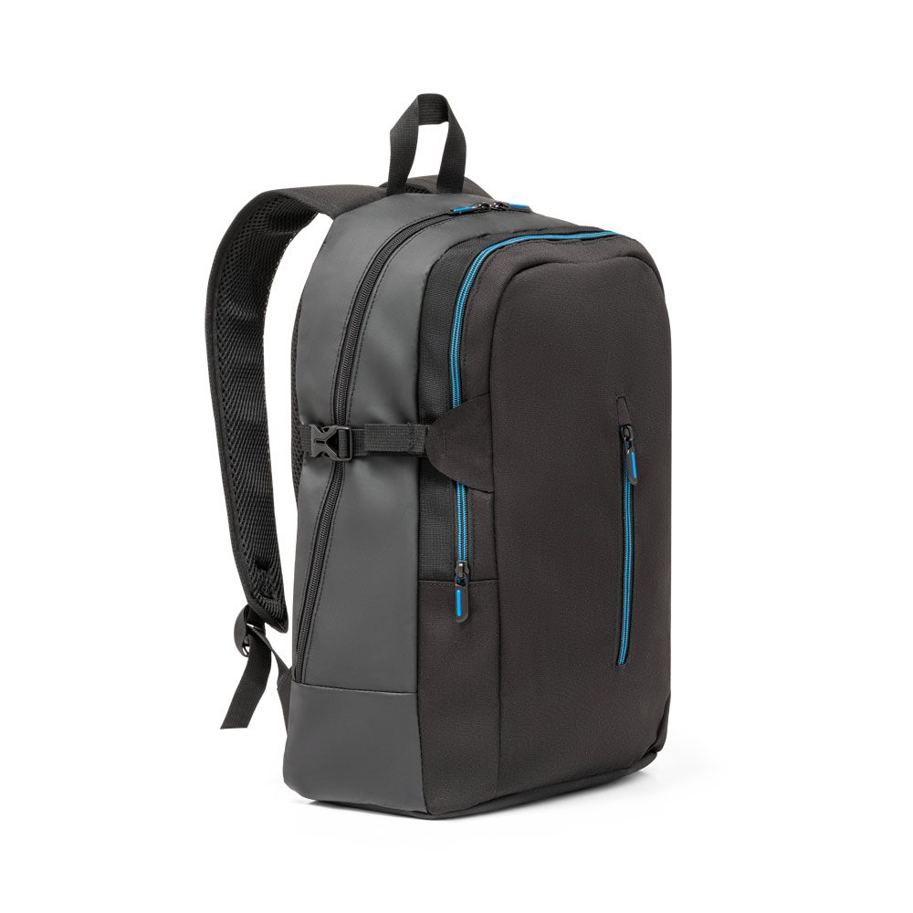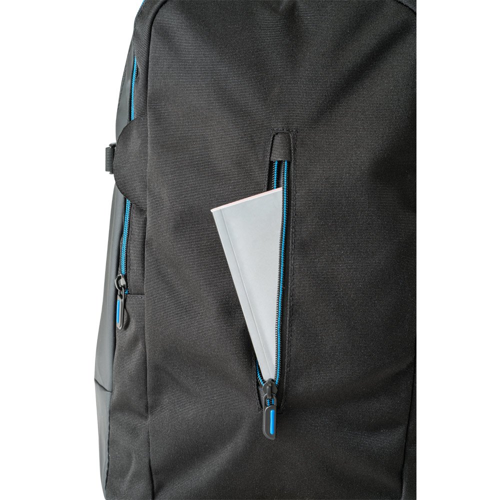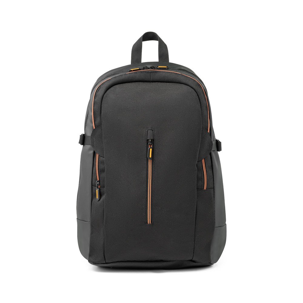 Mochila para notebook em 900D e c. sintético com 2 compartimentos principais e bolso frontal. O compartimento posterior é forrado e tem divisória almofadada para notebook até 15,6″ e bolso em tela, com zipper. O compartimento médio também é forrado e contém divesos bolsos interiores. A parte posterior e alças são almofadadas. 330 x 450 x 160 mm