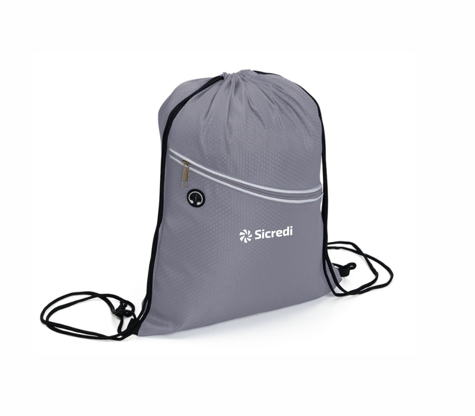 Descrição: Mochila saco em fibra de poliéster resistente à água com bolso frontal e entrada para fones de ouvido.