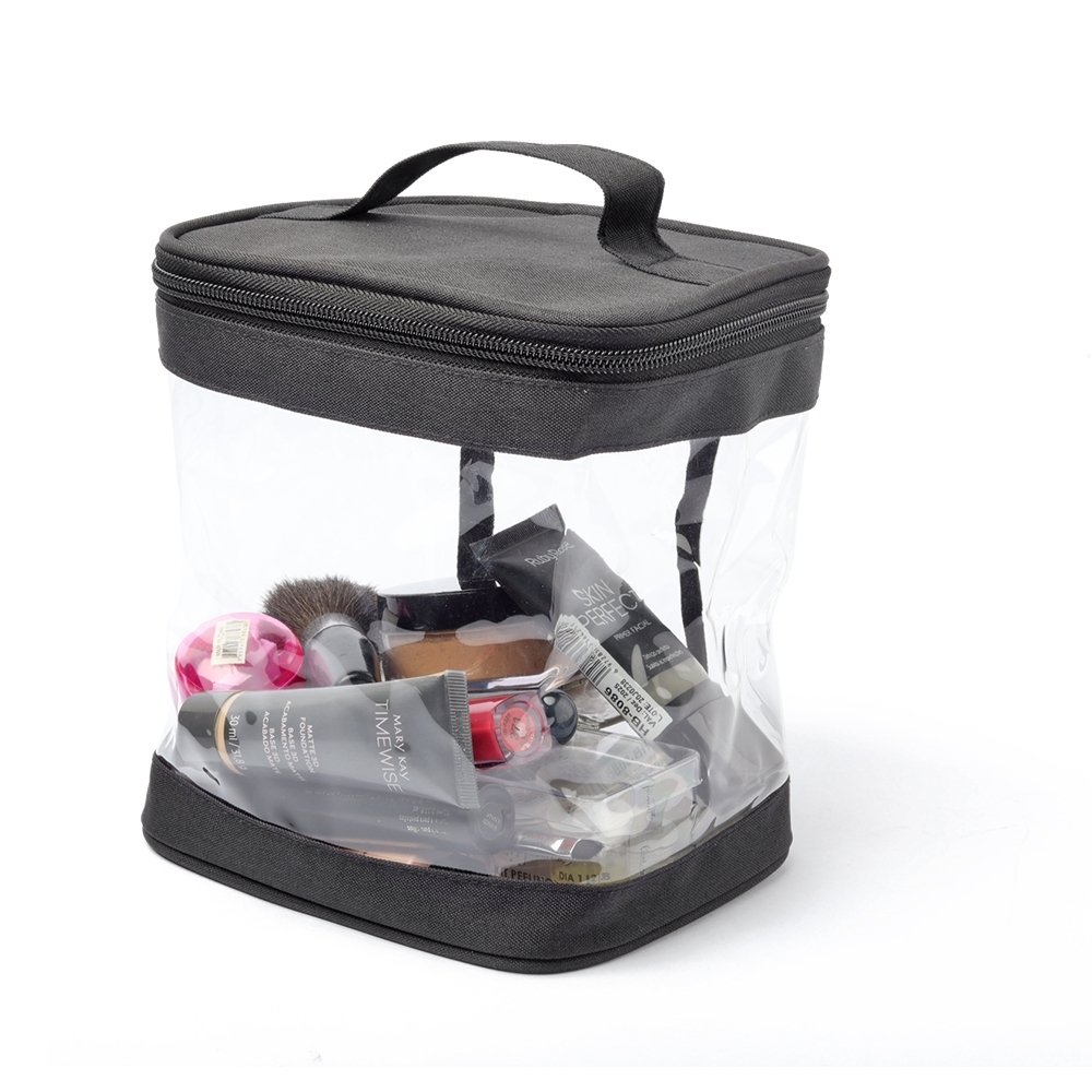 Descrição: Nécessaire em pvc com detalhe em poliéster.