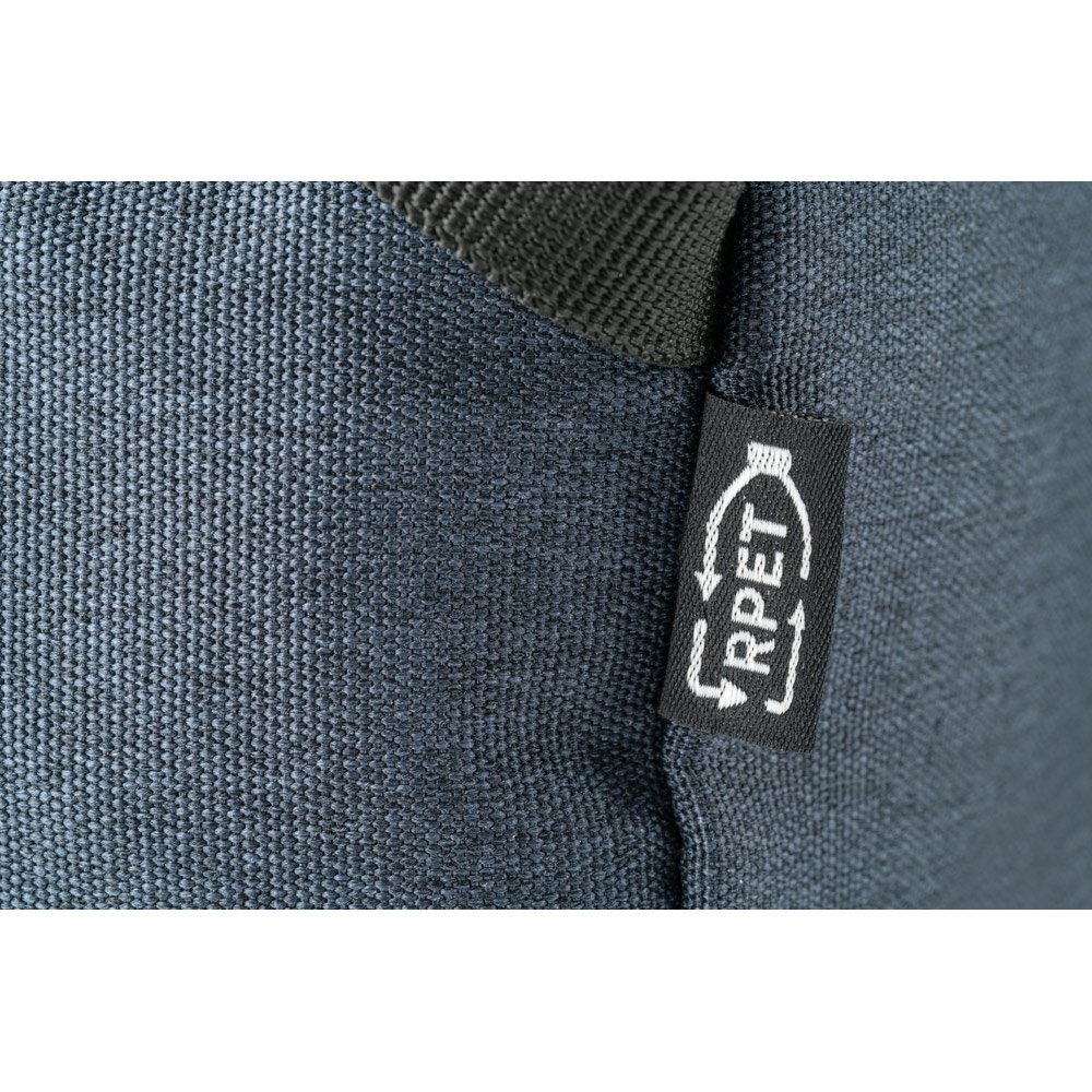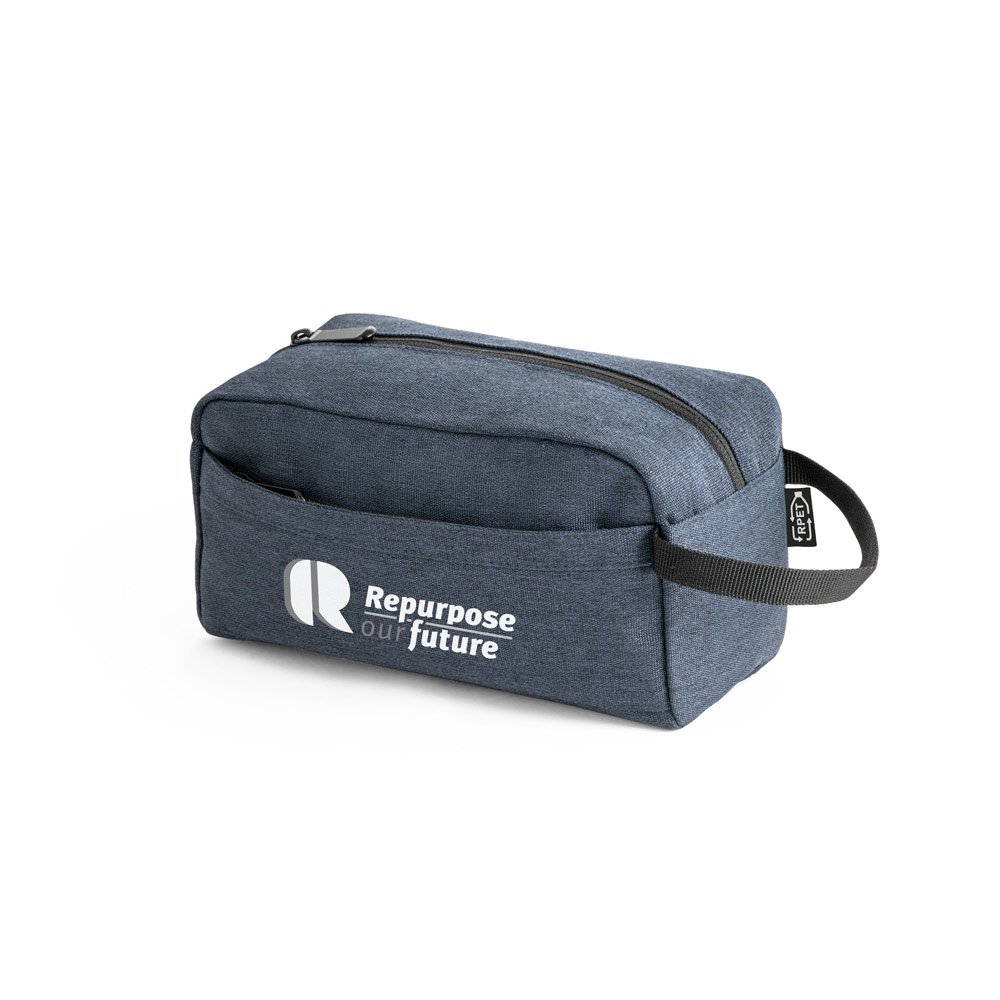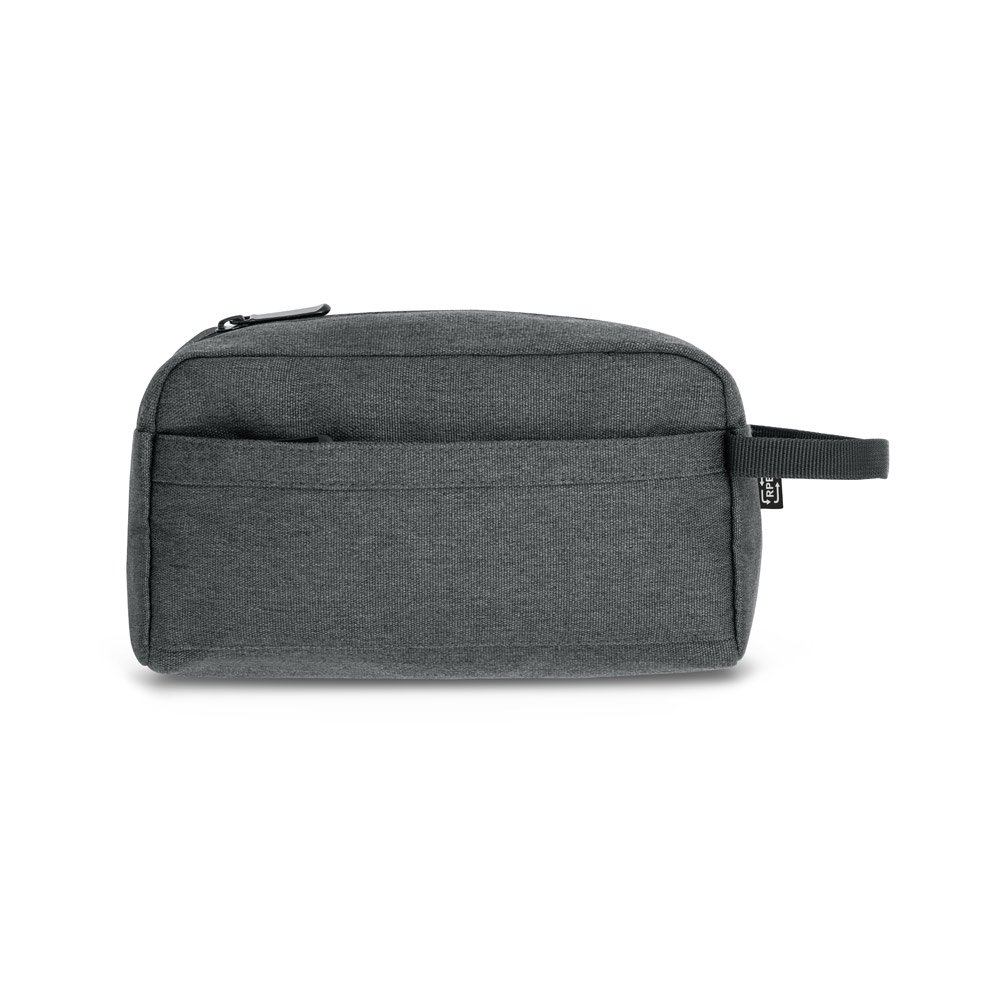 Nécessaire em rPET 600D com interior forrado. Bolso frontal com ziper e pega lateral em webbing. 220 x 120 x 110 mm