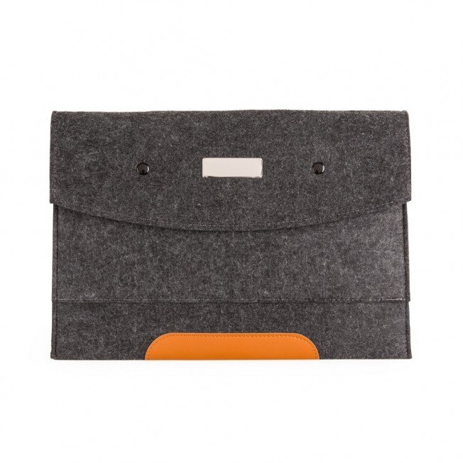 Pasta envelope com forro e uma divisória. Tecido de feltro com detalhe em couro sintético e dois botões pretos superiores. Acompanha placa metálica para personalização.