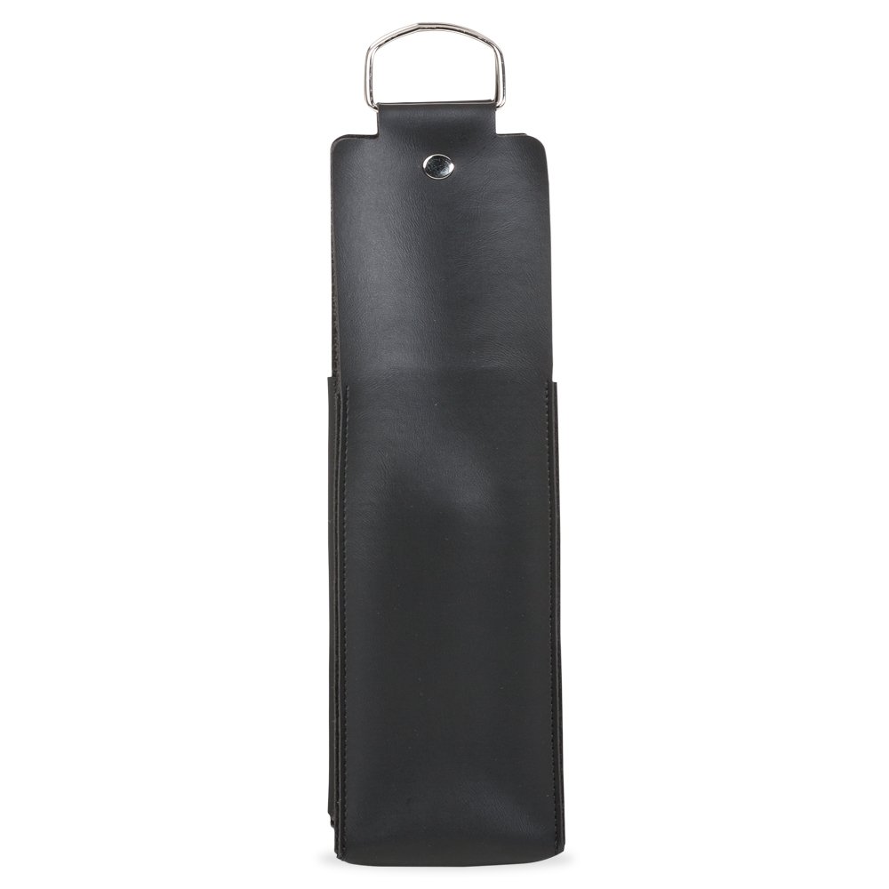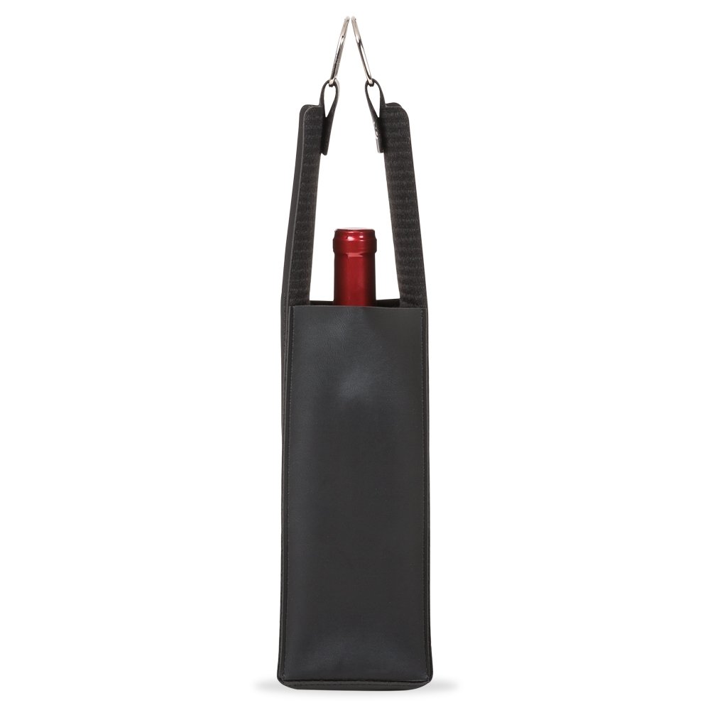 Descrição: Estojo porta vinho em couro sintético bidim, contém duas alças metálicas e botão para lacre.