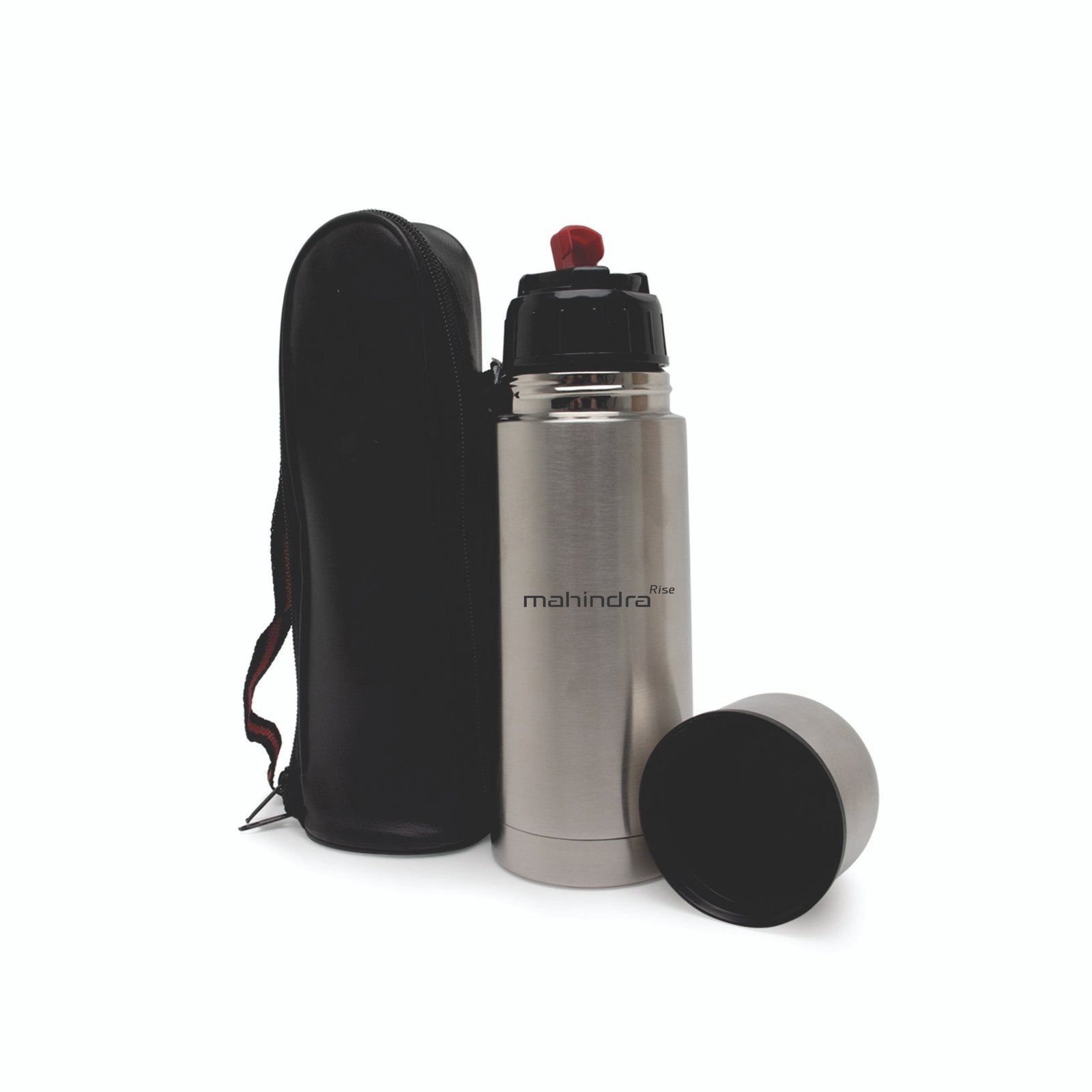 Descrição: Garrafa térmica 350ml em inox com tampa rosqueável, tampa interna em plástico resistente. Acompanha capa protetora de couro sintético com alça de nylon.