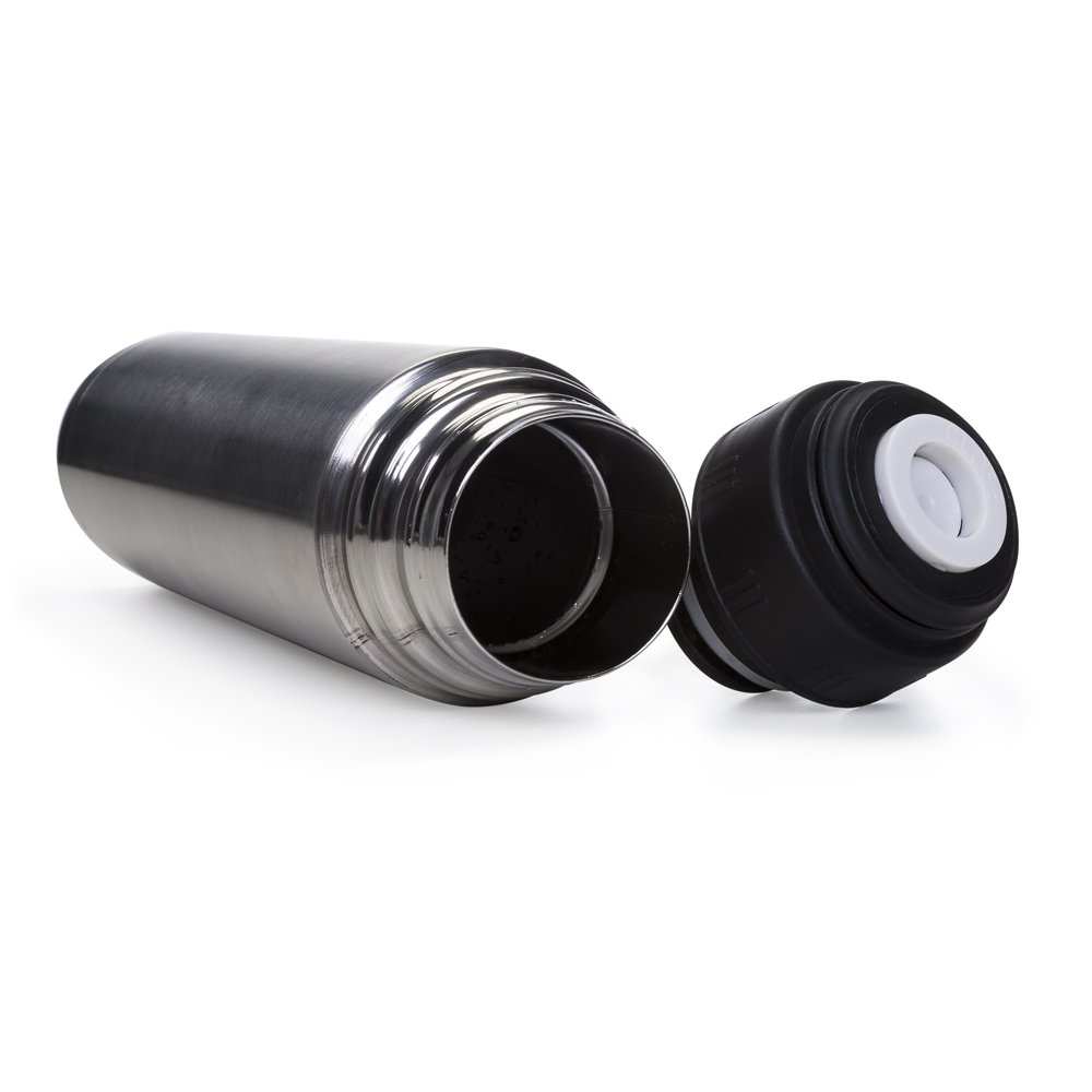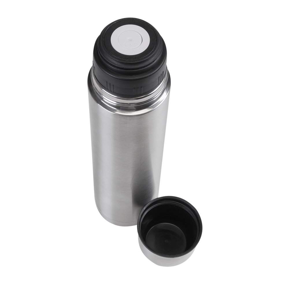 Descrição: Garrafa térmica 1L em inox com tampa rosqueável, tampa interna em plástico resistente(basta um clique para abrir ou fechar). Acompanha capa protetora de couro sintético com alça em nylon e detalhe vermelho.