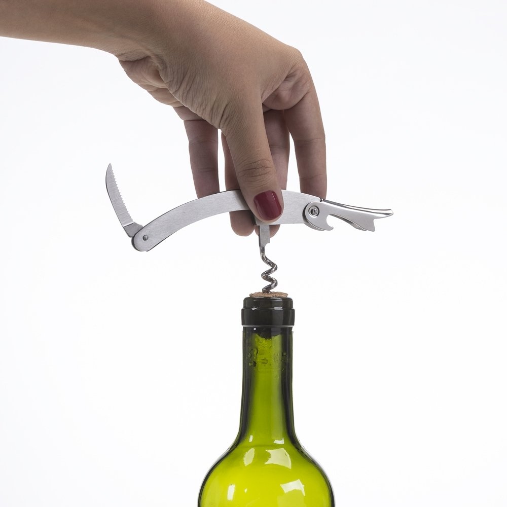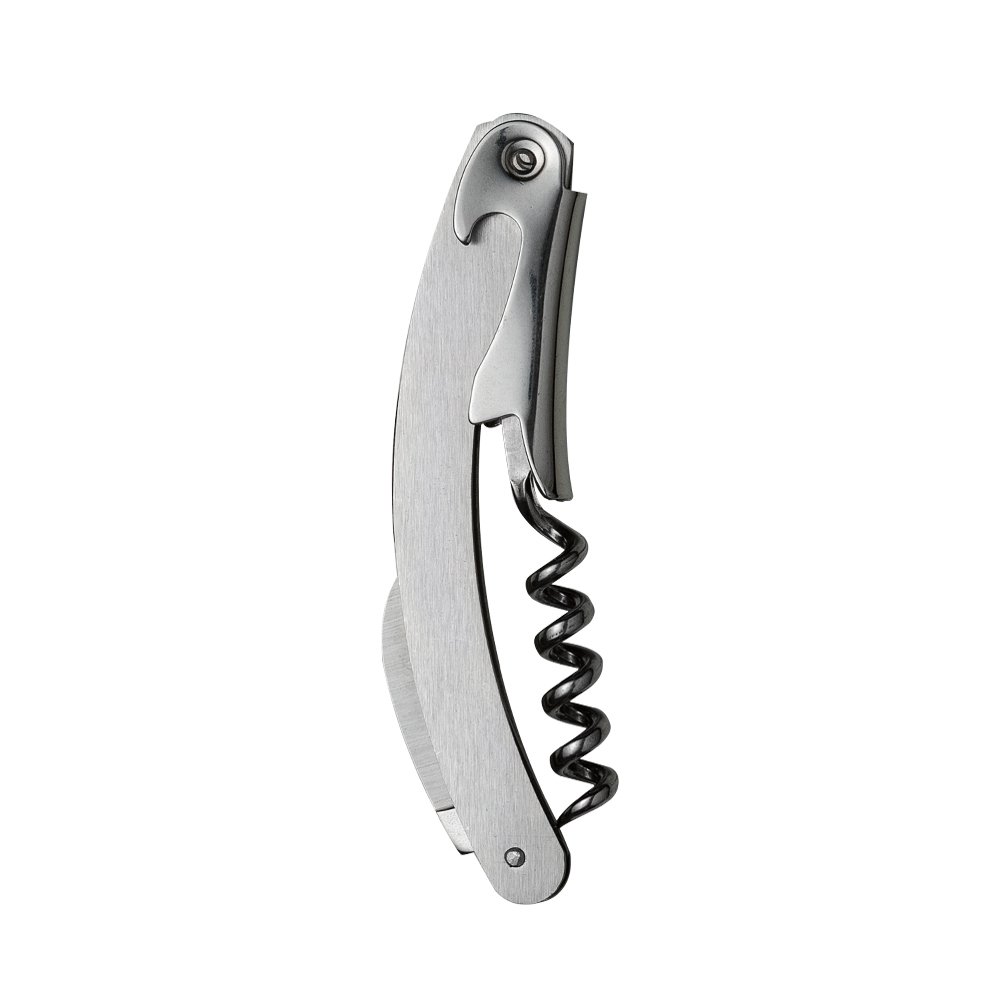 Descrição: Saca rolhas metálico com lâmina de corte e abridor de garrafa.