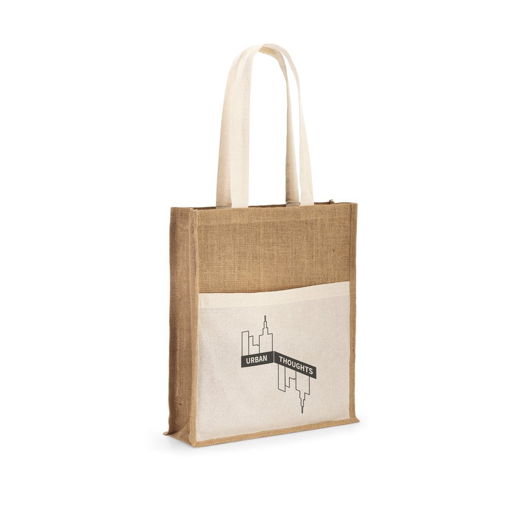 Sacola em juta (240 g/m²) com alças de 65 cm e um bolso frontal 100% algodão (140 gm²). 370 x 410 x 100 mm | Bolso: 370 x 270 mm