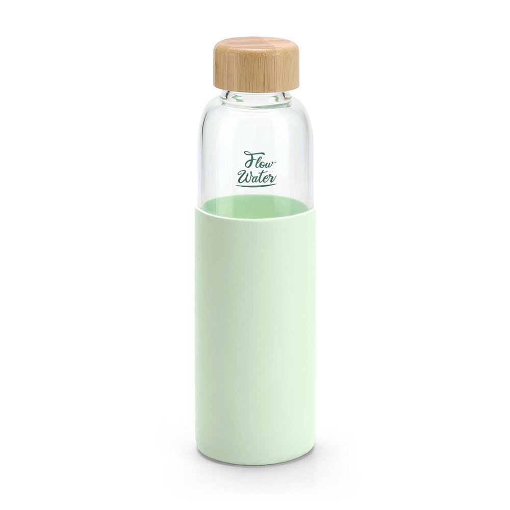 Squeeze em vidro borossilicato revestida com luva em silicone e com tampa em bambu. Capacidade até 600 ml. Food grade. Fornecida em caixa. ø68 x 231 mm