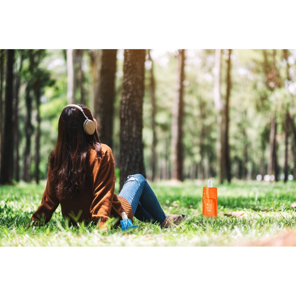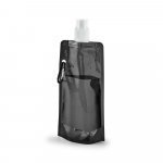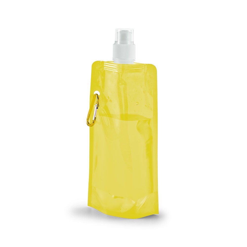 Squeze dobrável em PE com bico de sistema “push-pull” e acabamento translúcido. Contém uma tampa transparente e um mosquetão. Capacidade até 460 ml. Food grade. 120 x 265 x 30 mm